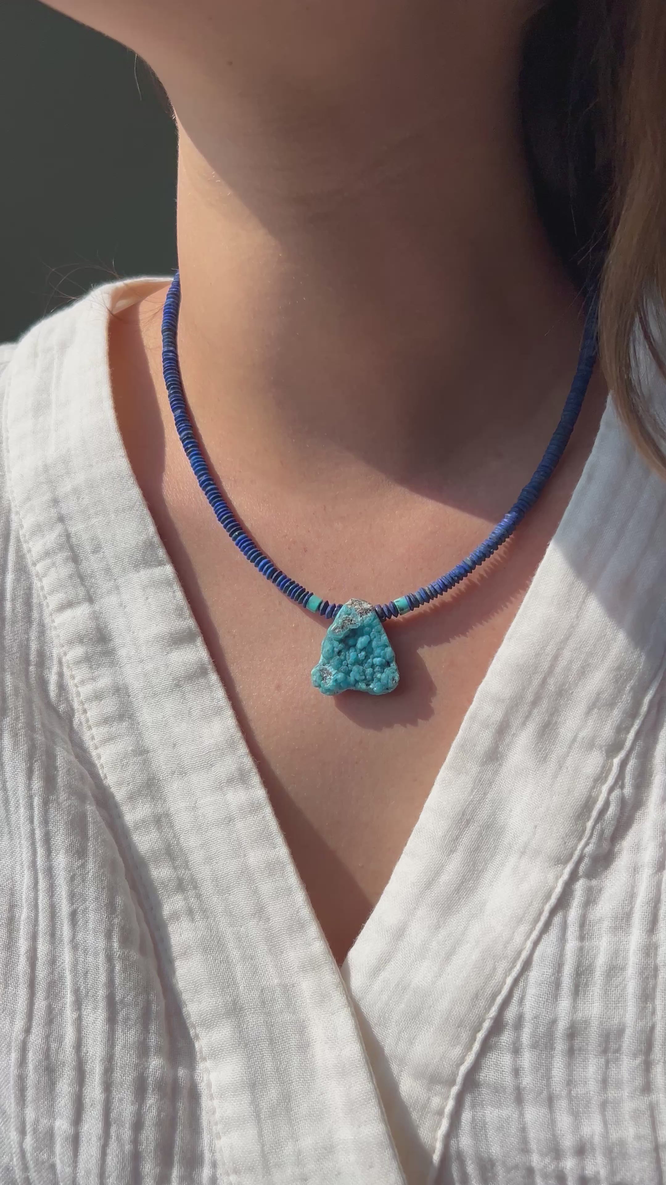 Natúr hemimorfit medál lápisz lazuli láncon türkiz csiszolatokkal. A tenger kékjeit megidéző lánc, mely lendülettel, kifejezőkészséggel és megértéssel ajándékoz meg a mindennapokban.