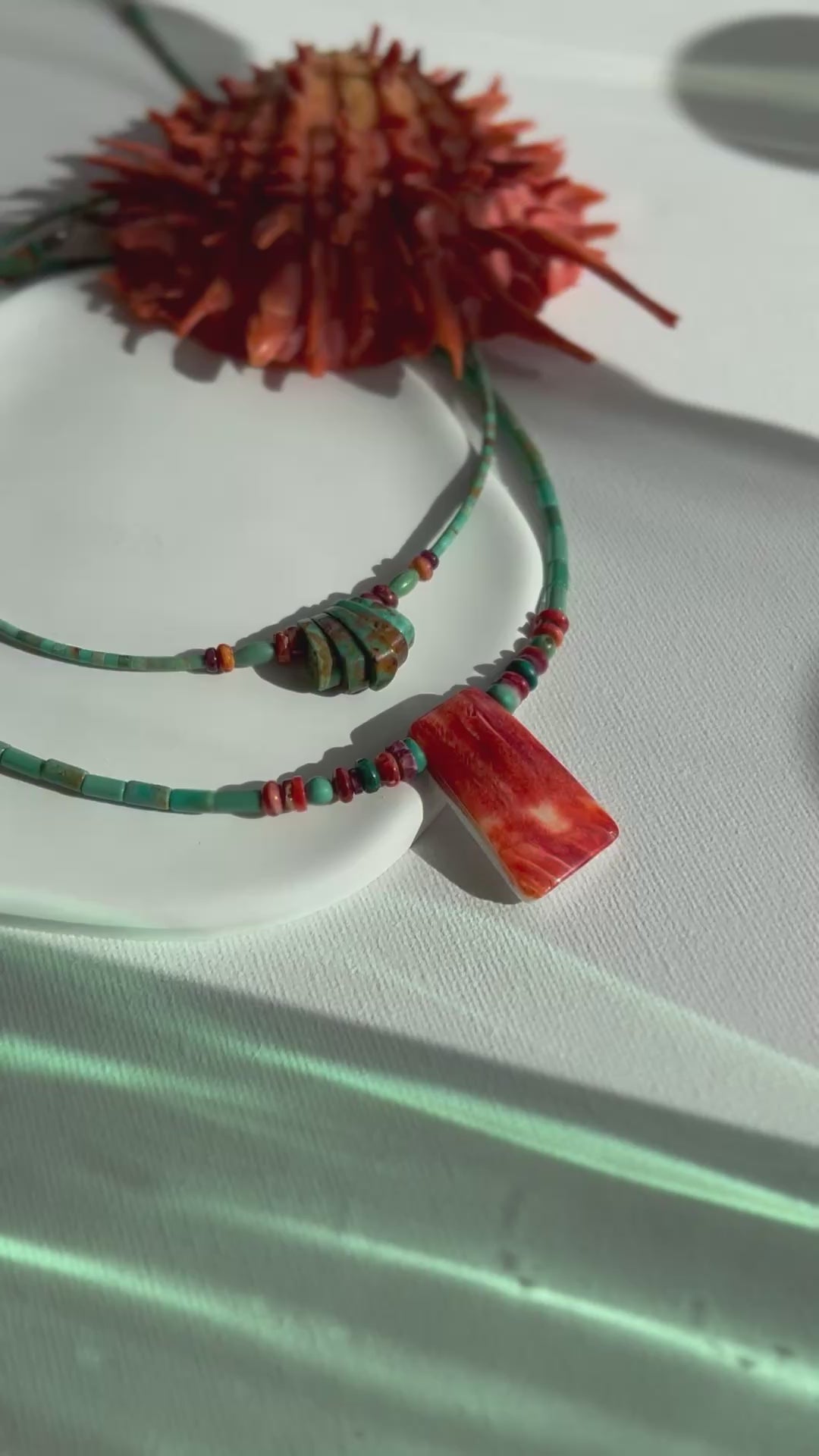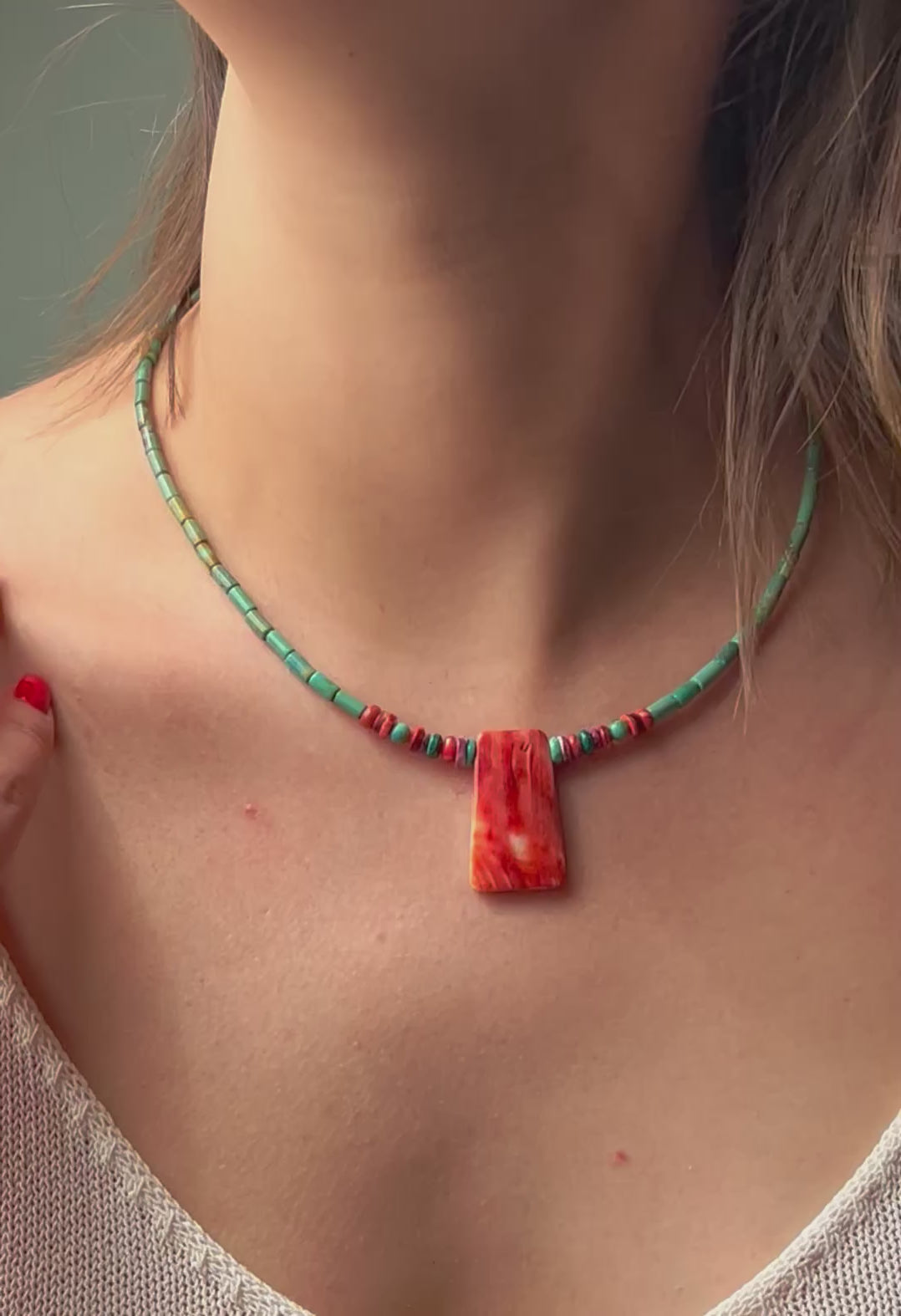 Egyedi zöld türkiz nyaklánc narancs színű Spondylus kagyló csiszolattal. Izgalmas színkombináció a nőies megjelenésért.