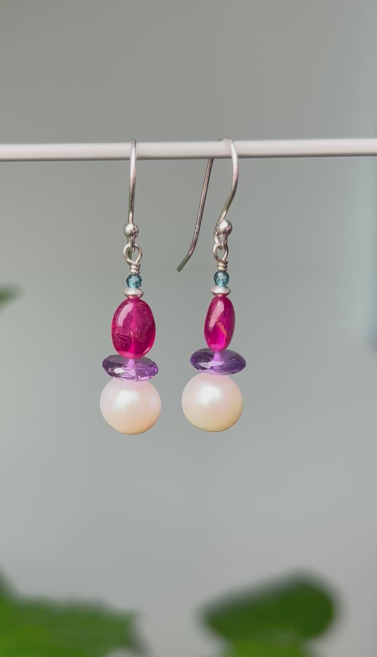Fülbevaló fehér édesvízi gyöngyökkel, rubin, ametiszt és topáz csiszolatokkal. Igazi különleges ásványkoktél egy fülbevalóban, ami a színeken túl, ragyogó energiákkal ajándékoz majd meg mindennapjaidban.