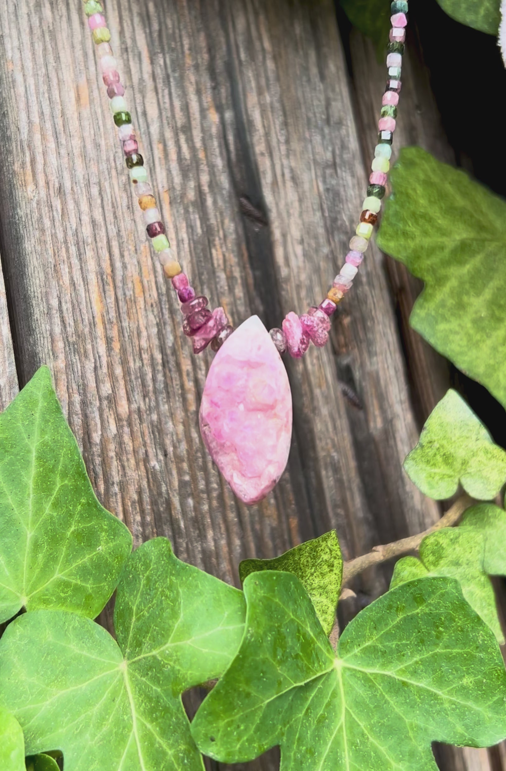 Egyedülálló színkoktél natúr kobalt kalcit medállal és rubellittel, vegyes színű turmalin láncon. Játékosság és tiszta erő egy igazán szerethető láncban.