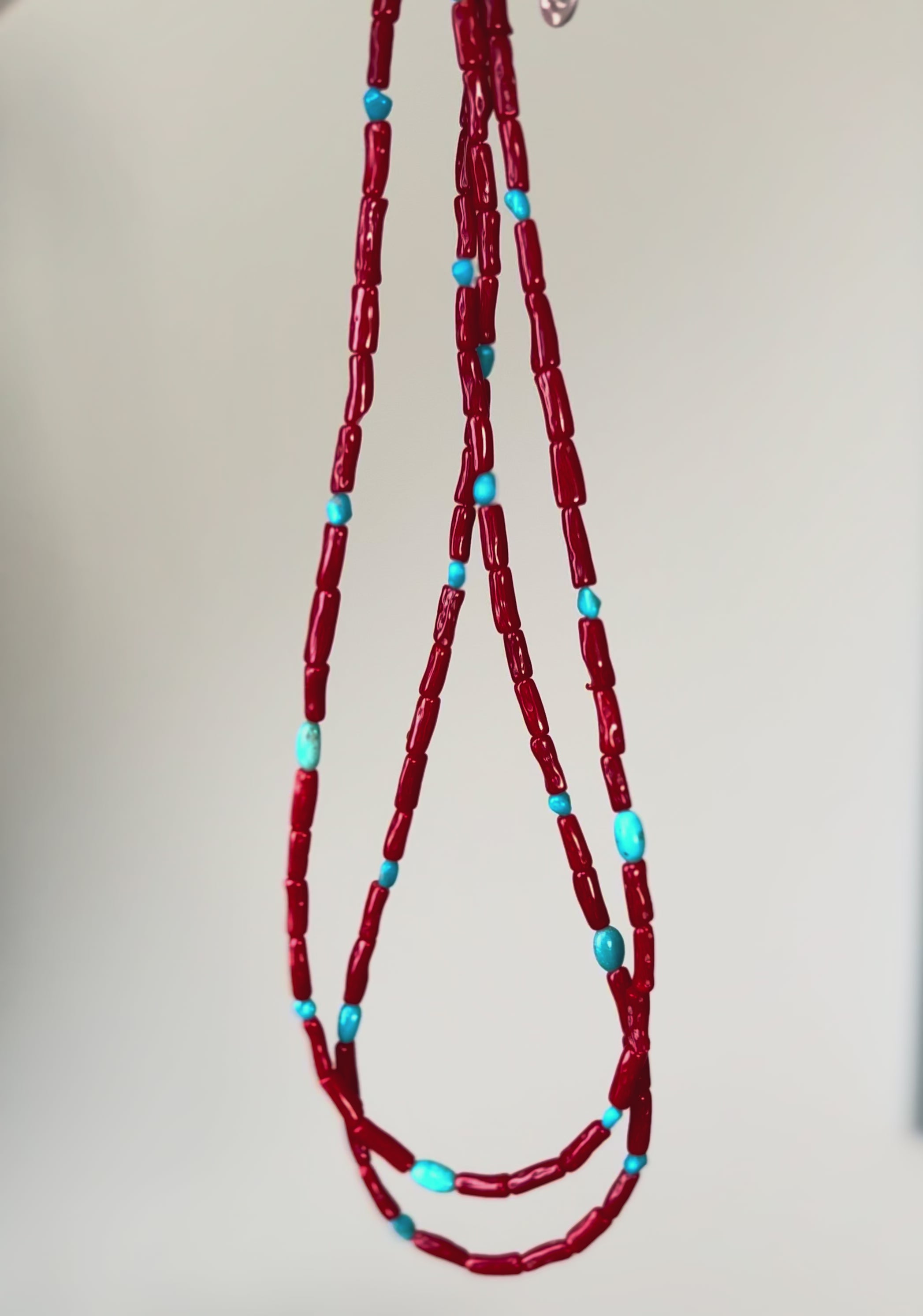 Extravagáns kétsoros nyaklánc mediterrán vörös korallból, Sleeping Beauty türkiz csiszolatokkal. Ha kedveled a feltűnőbb darabokat, akkor ez akár a kedvenced is lehet!