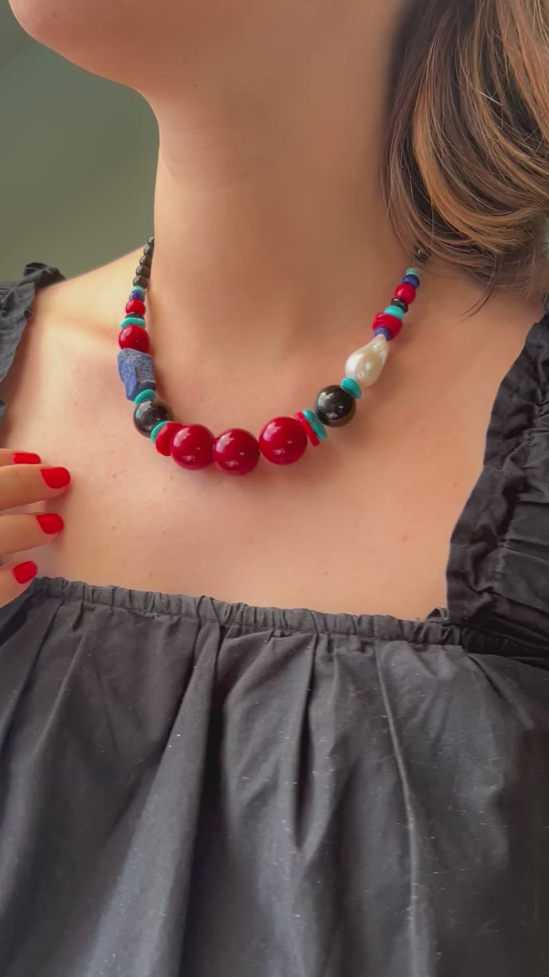Egyedülálló nyaklánc több különleges drágakőből, mint az élénk vörös korall, türkiz, lápisz lazuli, barokk gyöngy és ónix. Válaszd akár szettben PIMUKA-MIR karkötővel együtt az egyedi megjelenésért.
