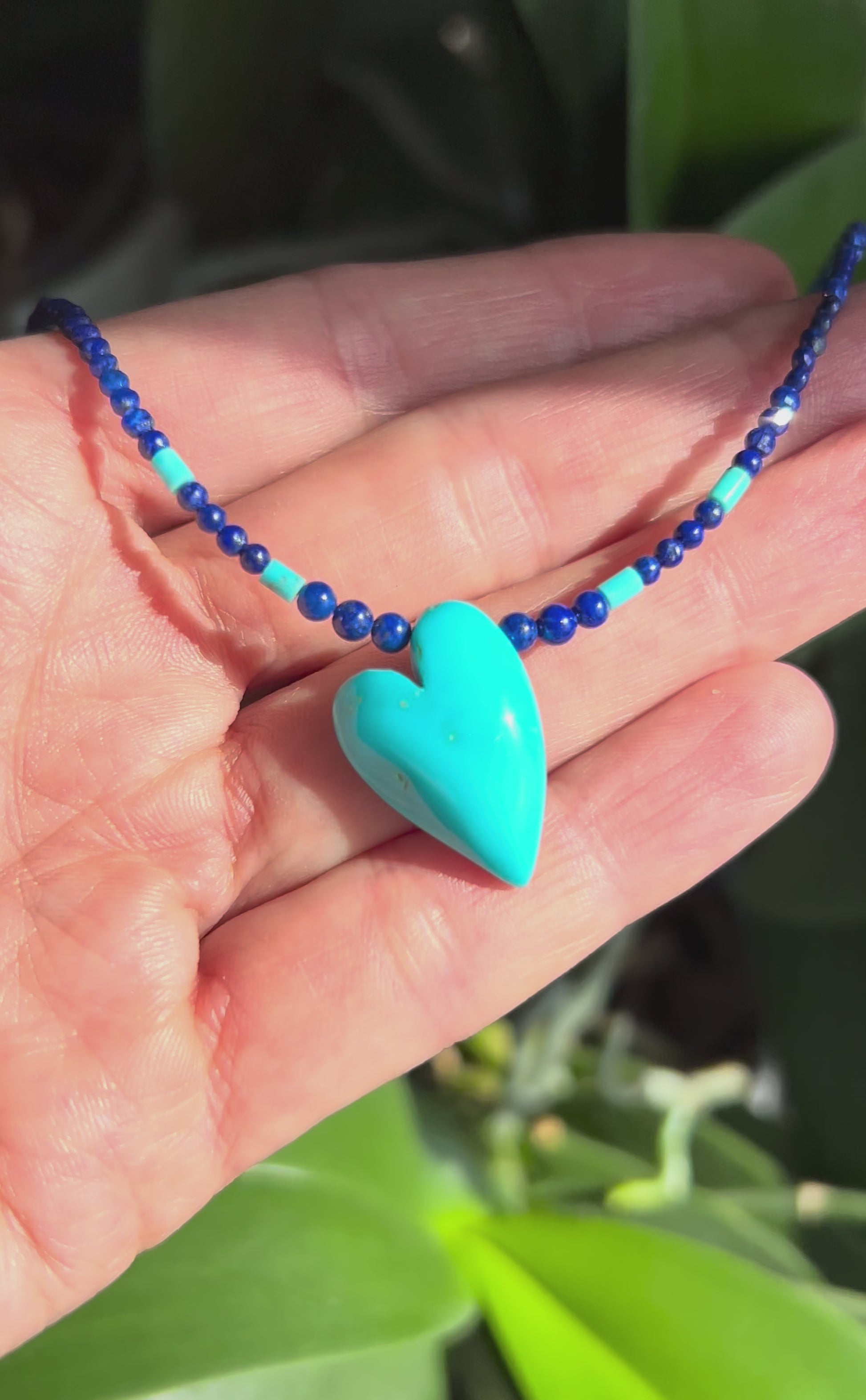 Lápisz Lazuli nyaklánc , kézzel csiszolt, arizónai türkiz szív medállal. Két ragyogó kék csodás kombinációja, védelem és támogatás egy láncban.